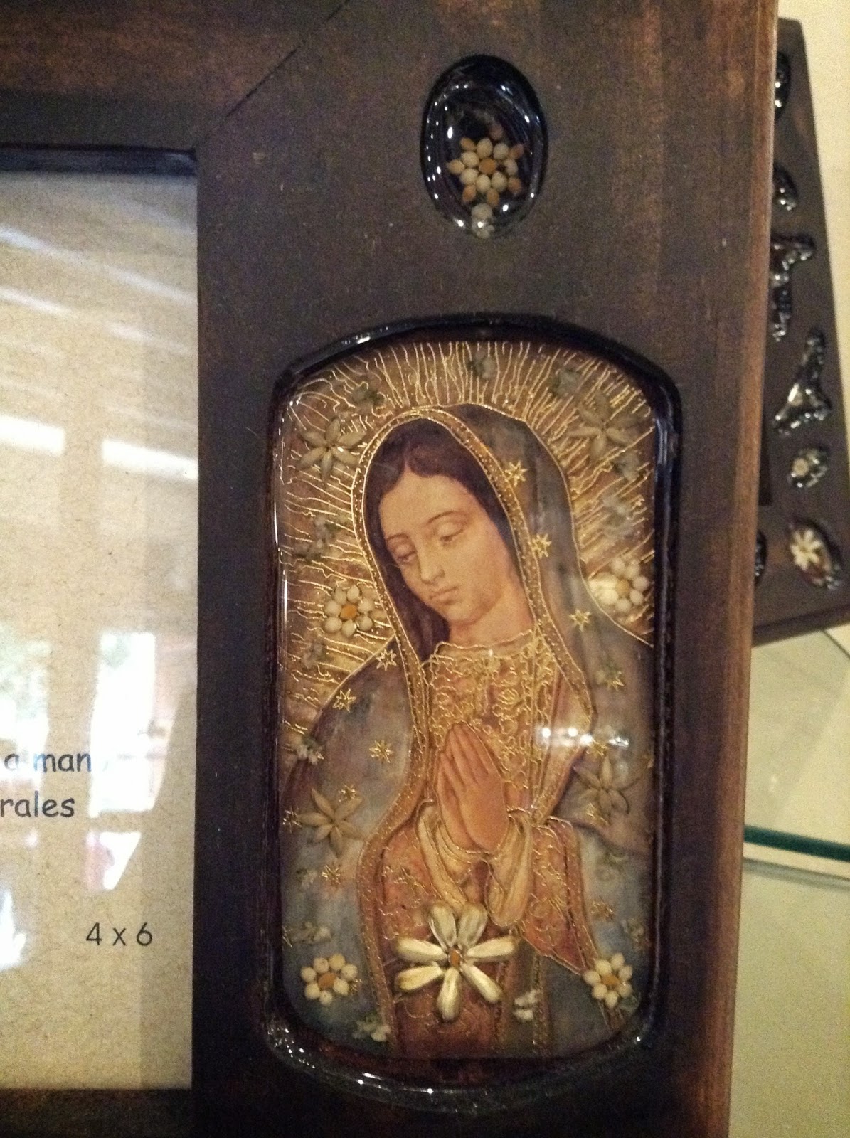 | 07/06/14 Market Teotihuacán, México The image of the Virgin of Guadalupe is simple. The complexion of her and the angel are darker showing the indigenous side. |